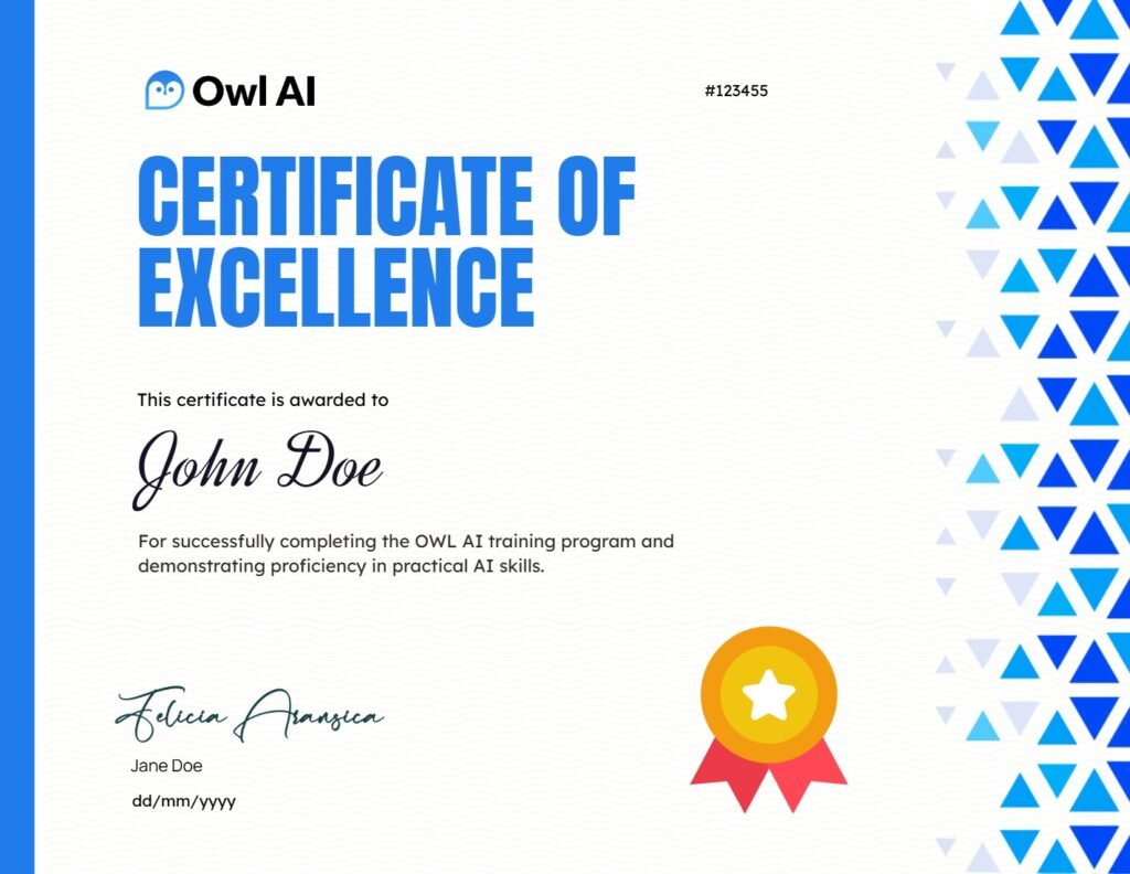 Complete the course and earn an official OWL AI certificate. Showcase your new AI skills to employers, clients, and colleagues — and prove you’re ahead of the curve.